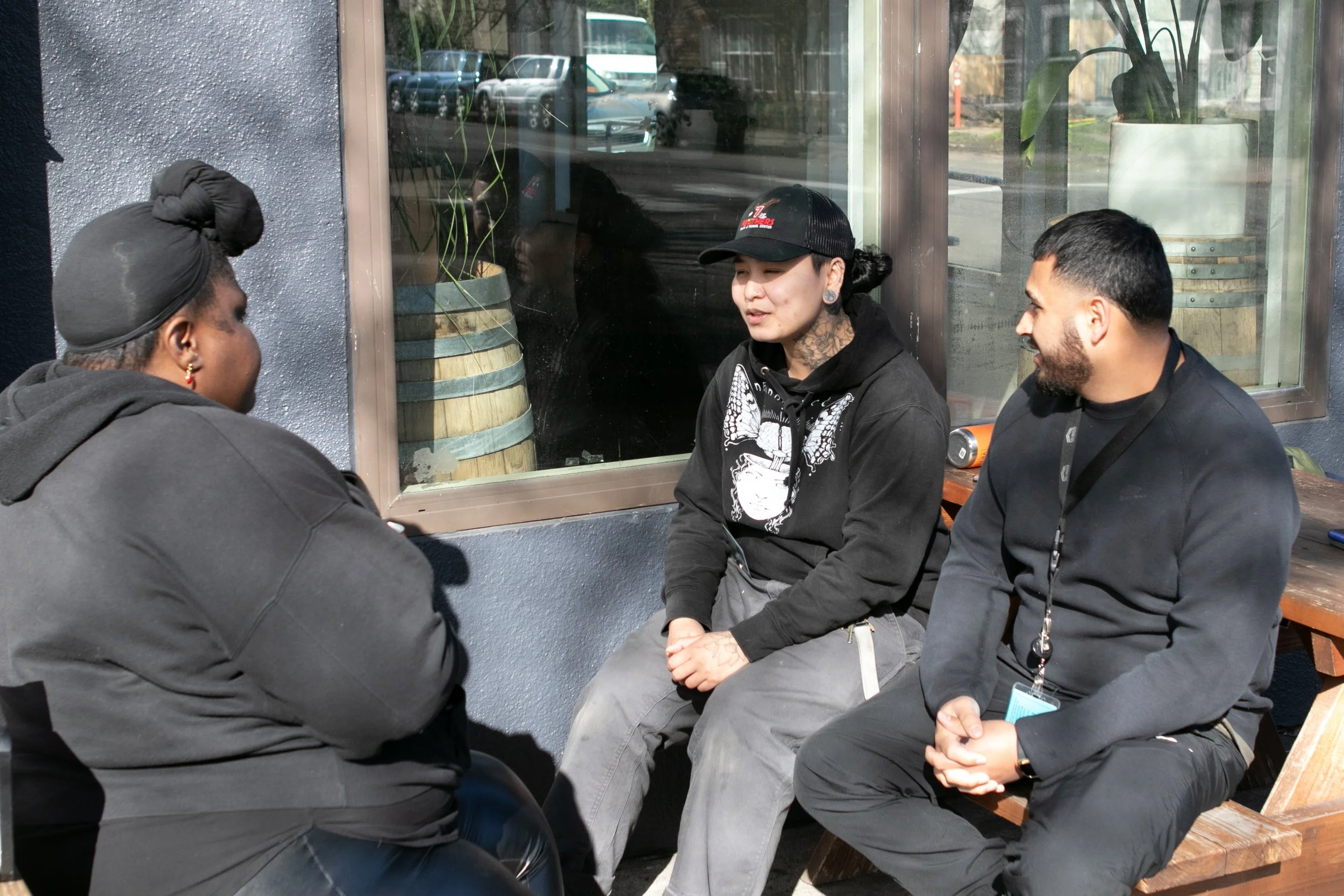 Erica (left) speaking with Do Good WRAP team members Kat (middle) and Eddie (right).